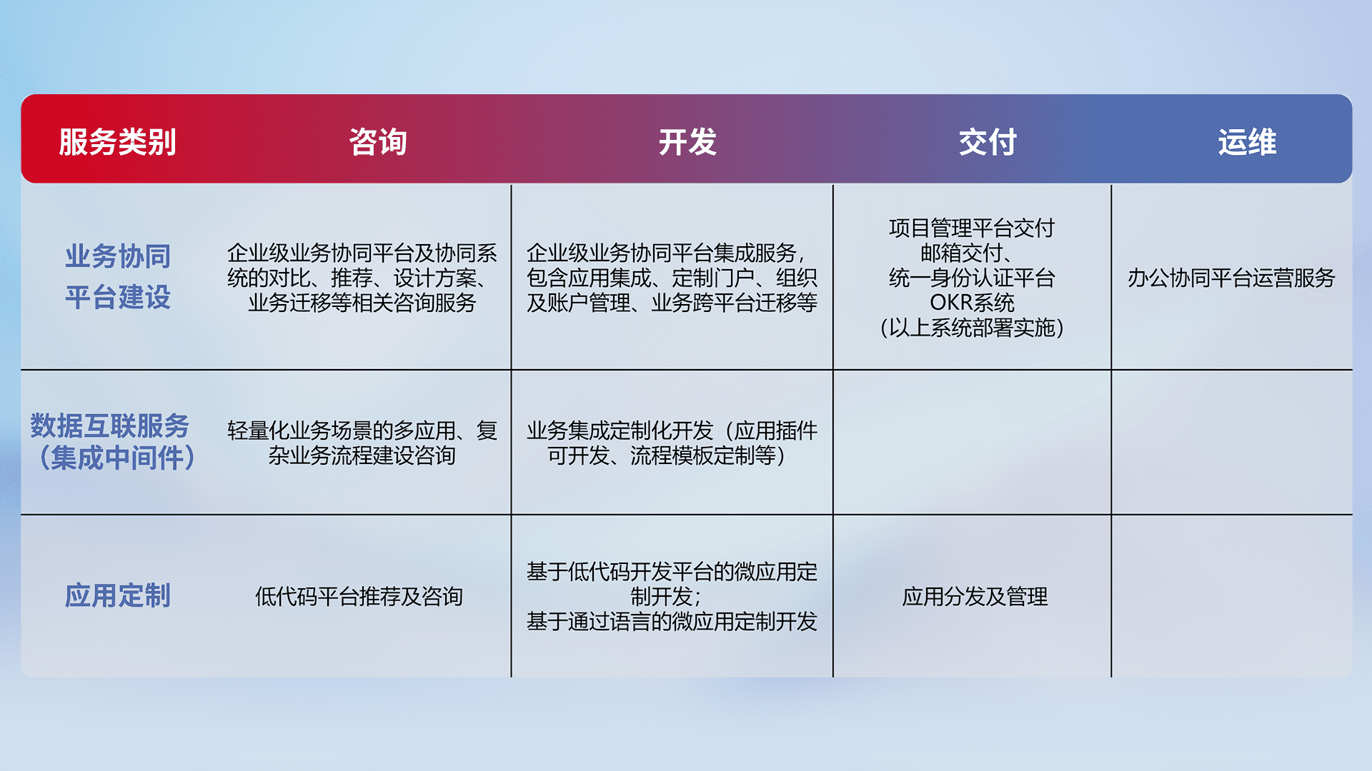 针对钉钉、、企微、、、、IDaas等平台级产品提供产品的规划、、、方案、、、交付、、定制化开发等服务,,,实现如统一协同办公、、、、智能客户服务、、、混合会议管理、、、、智能数据查询、、、、等业务场景,,,实现数字化转型。。。。